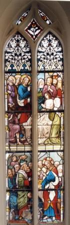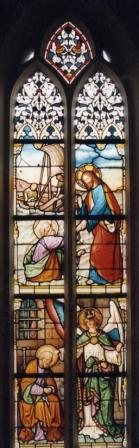 In het eerste raam zien we de opwekking van het dochtertje van Jairus. Links van Jezus zien we twee van zijn leerlingen. Zowel bij Marcus (5:35-43) als Lucas (8:49-56) is dit verhaal te lezen. Onder zien we hoe de tafelmeester proeft van de (heerlijke) wijn. Jezus heeft op verzoek van Maria (rechts van Jezus) zijn eerste wonder verricht op de bruiloft te Kana. Zie Johannes 2:1-11 .