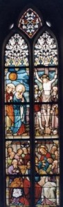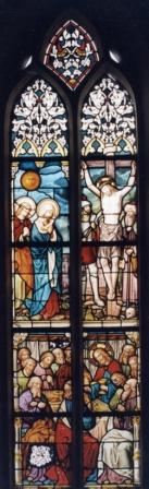 Op het tweede raam boven zien we de kruisdood van Jezus. Links van hem staan Maria en Johannes. Een soldaat steekt de lans in Jezus’ zijde. De figuur rechts is waarschijnlijk Jozef van Arimathea.