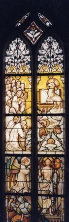 Het derde raam stelt een tafereel voor uit de Apocalyps (boek der Openbaring) van Johannes: de aanbidding van het Lam, dat het boek des levens heeft geopend. Een grote schare van heiligen verkondigt Zijn Lof, onder wie ook de vier evangelisten (paneeltje middenrechts). We zien de engel (Mattheus), de leeuw (Marcus), de stier (Lucas) en de adelaar (Johannes).